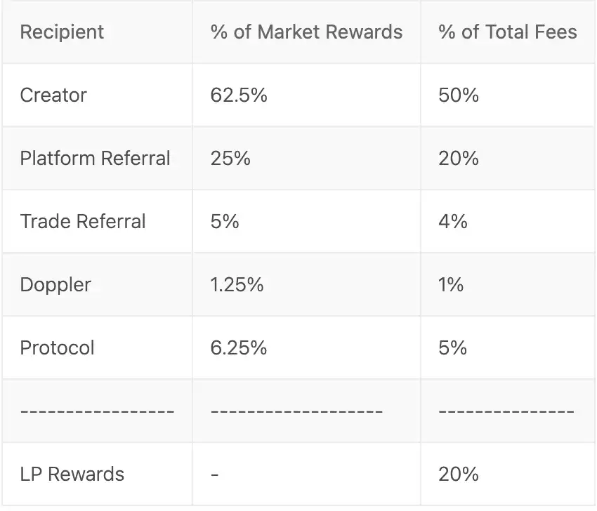 更核心的创新在 Zora 的收益分配模型设计上,Zora 平台上的代币交易费从早期的 3% 下降至 1%,其中 50% 直接支付给创作者,20% 作为代币永久流动锁定,永久增加交易池子深度,20% 奖励给推荐创作者部署代币的开发者/平台,4% 作为特定交易地址奖励,5% 进入平台国库。