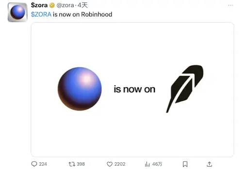 10 月 10 日,Zora 宣布上线 Robinhood,作为首个在 Robinhood 上线的 Base 生态代币,上线当日$Zora 价格从 0.05 直线上涨约 70% 至 0.085,24 小时交易量暴涨约 780% 至 5.69 亿美元,为$Zora 带来巨量流动性改善,另一方面,上线 Robinhood 也标志着主流市场对 Zora 的价值认可以及对 Base 生态发展的关注。