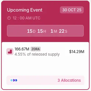 更直接的投资风险在于代币解锁,10 月 30 日将会有 1.6 亿枚 Zora 代币解锁,占总供应量的 4.55%,短期内可能形成较大抛压。